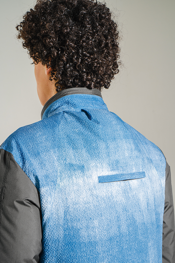 ・デニム柄をプリントしたシアサッカー素材で高い遮熱性を発揮します。