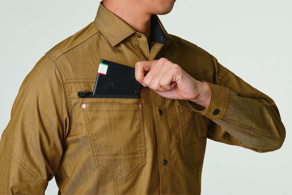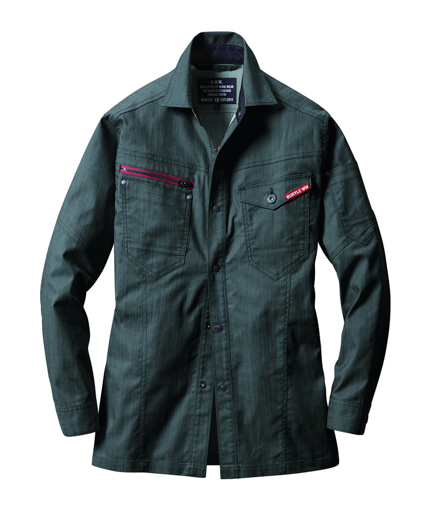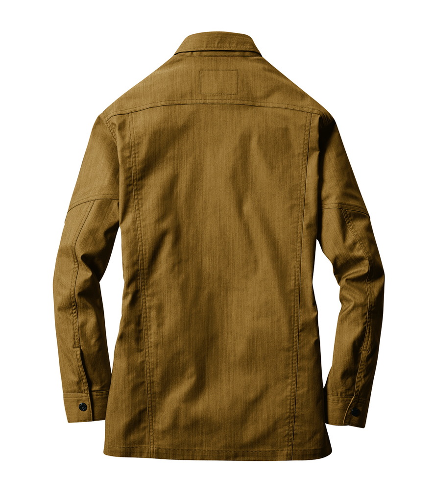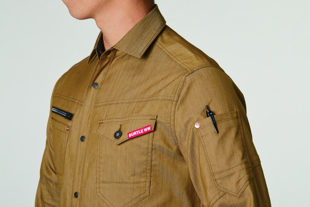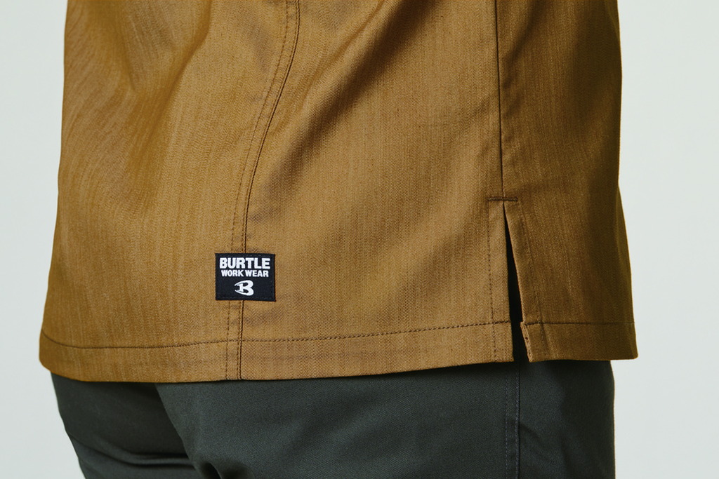 ムラ糸を使い片サイド染めを施して、デニムティストのエッセンスを取り入れたユニフォーム素材が企業ユニフォームのフォーマルさに程よくカジュアルムードをプラス。しなやかでストレッチ性があり程よく細身なシルエットが 企業ユニフォームをスタイリッシュなルックスに演出。 シックなアーバンブラウンにミルスグリーンをドッキングさせる ギミックで一味違ったユニフォームスタイルに アップデートする手法はバートルの真骨頂。