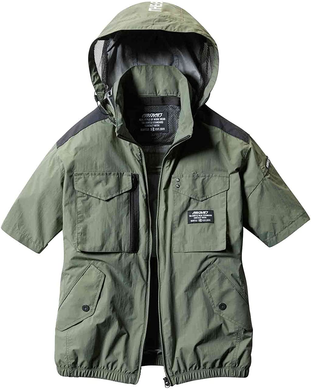 ユニセックス、撥水/防汚★撥水性、耐久性、 軽量を兼備し空気漏れを防ぐ タスランナイロンクロス(AC仕様)★アルミコーティングを施しUVカット、-9度の遮熱効果を確保 (未加工素材比較)★背ヨークに保冷剤を収納可能な通気エアダクトポケットを装備★フックハンガー、ランヤード装着ホールを配備し フルハーネスに完全対応★ヘルメットに対応する大型フードは用途に合わせ着脱可能 ★男女ユニセックスの着用に対応
