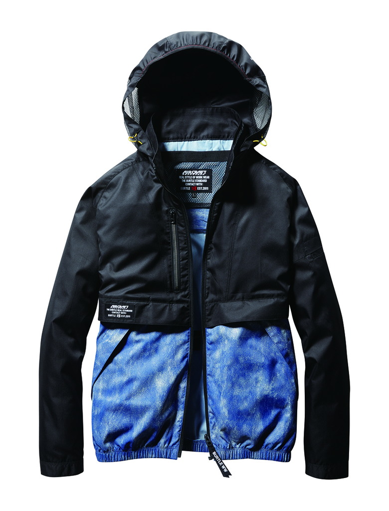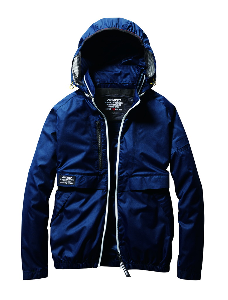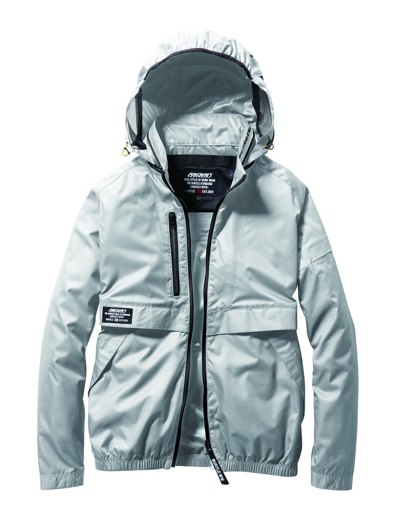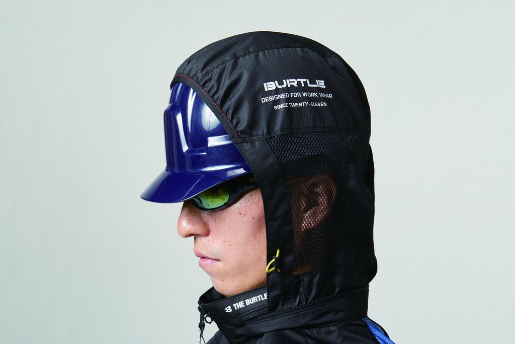 ★視認性、音、ヘルメットに対応するメッシュ構造フードは ファスナー衿に収納可能