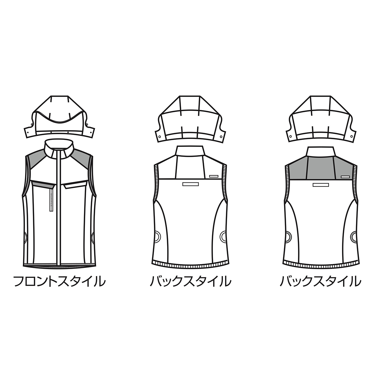 このベストは、ヘルメットに対応する大型フードが付いており、用途に合わせて脱着可能です。また、男女ユニセックスの着用に対応しているため、幅広いユーザーにお使いいただけます。その他の機能として、大型フードスピンドル付き、ハーネス用フックハンガー取出口、ブロックテーピーポケット、脇ポケット、両脇サイドファン、ランヤード取付口、コードホール、通気エアダクトポケット、ダイレクトエアー、コードストッパー、バッテリー収納ポケット、内バッテリーポケット、コードループが備わっています。